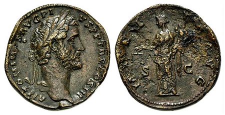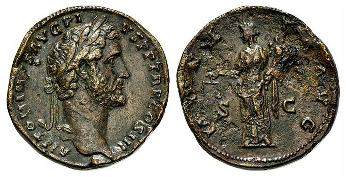 Antoninus Pius (138-161), Sestertius, Rome, ca. 141-3. AE (g 22,53; mm 32; h 6). ANTONINVS AVG PIVS P P TR P COS III, Laureate head r.; Rv. MONETA AVG, Moneta standing l., holding scales and cornucopia. RIC 610. Brown patina, meta