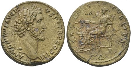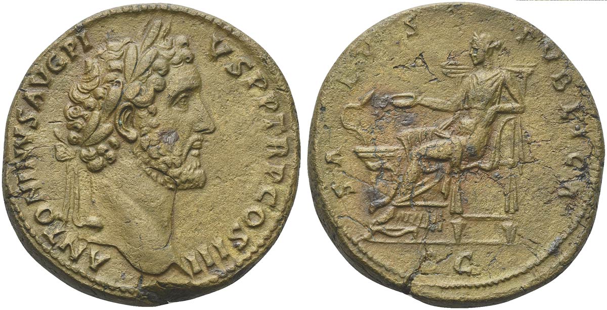 Antoninus Pius (138-161), Sestertius, Rome, 141-3. AE (g 28,32; mm 34; h 11). ANTONINVS AVG PIVS P P TR P COS III, Laureate head r., Rv. SALVS AVG, Salus seated l., feeding serpent from patera, S - C. RIC 638. Brown patina, near e