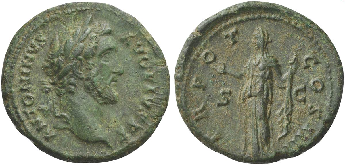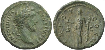 Antoninus Pius (138-161), As, Rome, 140-4. AE (g 11,41; mm 28; h 11). ANTONINVS AVG PIVS P P, Laureate head r., Rv. TR POT COS IIII, Pudicitia standing facing, head l., raising r. hand and holding veil with l. hand, S - C. RIC 702. Green patina, very fine - good very fine