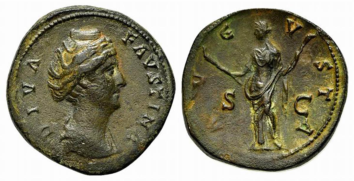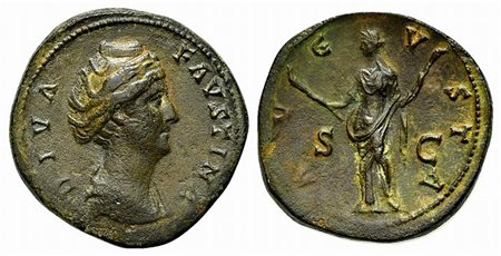Diva Faustina Senior (died AD 140/1), Sestertius, Rome, ca. 146-161. AE (g 25,49; mm 35; h 10). DIVA FAVSTINA, Draped bust r., wearing pearls bound on top of her head; Rv. AVGVSTA, Ceres standing l., holding torch in each hand, S