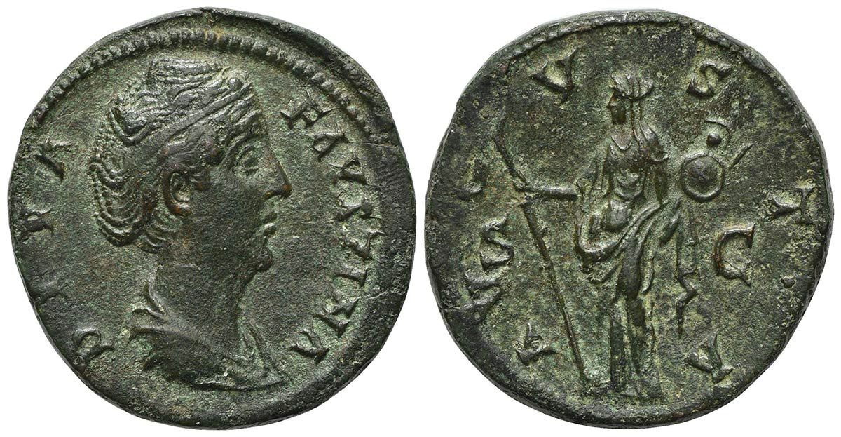 Diva Faustina Senior (died AD 141), Sestertius, Rome. AE (g 22,02; mm 31; h 12). DIVA FAVSTINA, Draped bust r.; Rv. AVGVSTA, Vesta standing l., holding long torch and palladium. RIC 1125 (Pius). Green patina, good very fine