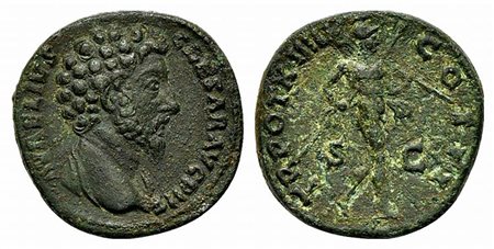 Marcus Aurelius (Caesar, 139-161), Sestertius, Rome, AD 160. AE (g 13,66; mm 26; h 12). AVRELIVS CAESAR AVG PII F, Bare head r., slight drapery; Rv. TR POT XIIII COS III, Mars advancing r., carrying spear and trophy. RIC 1354a (Pius). Green patina, very fine / good Fine
