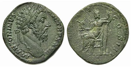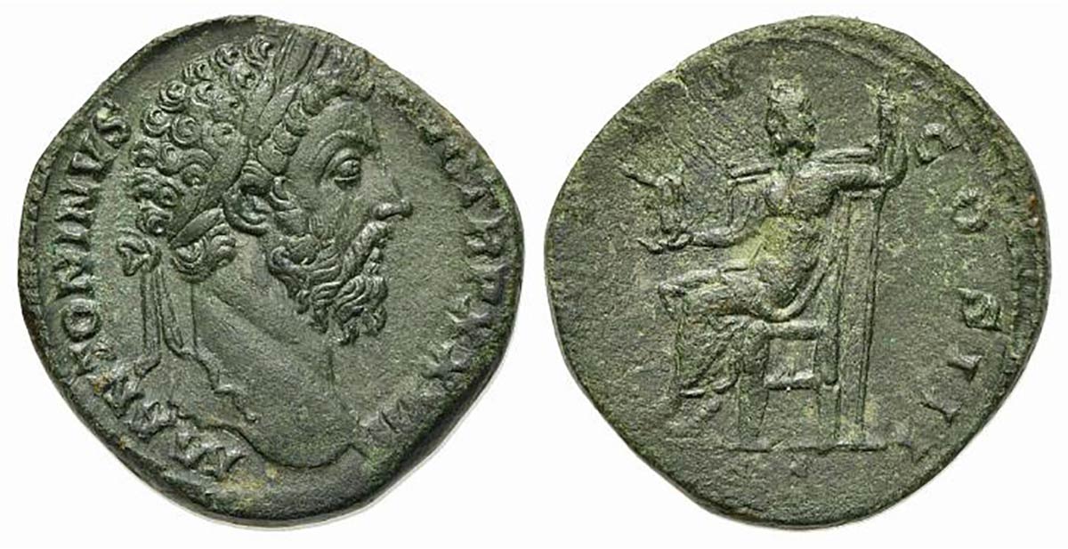 Marcus Aurelius (161-180), Sestertius, Rome, AD 174. AE (g 20,37; mm 30; h 12). M ANTONINVS AVG TR P XXVIII, Laureate head r.; Rv. IMP VI COS III, Jupiter seated l., holding Victory and sceptre, S C. RIC 1096. Green patina, very f