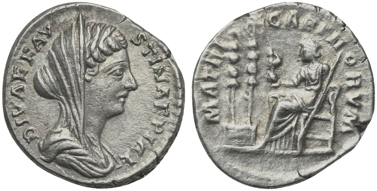 Diva Faustina Junior (died AD 175/6), Denarius, Rome, ca. 175-176. AR (g 3,46; mm 19; h 6). DIVAE FAV-STINAE PIAE, Veiled and draped bust r., Rv. MATRI CASTRORVM, Faustina seated l., holding globe surmounted by Phoenix and sceptre