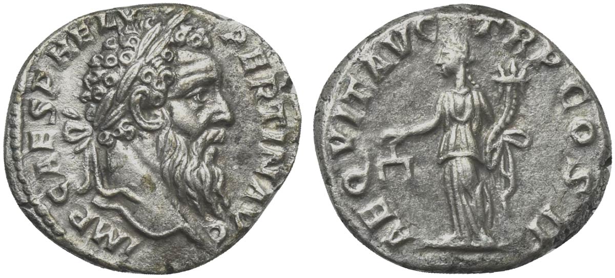 Pertinax (AD 193), Denarius, Rome. AR (g 3,08; mm 18; h 6). IMP CAES P HELV PERTIN AVG, Laureate head r., Rv. AEQVITAS TR P COS II, Aequitas standing l., holding scales and cornucopia. RIC 1a; RSC 2. Toned, good very fine