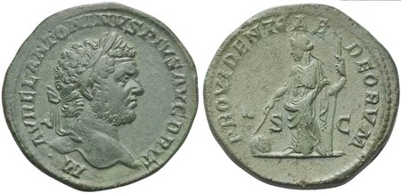Caracalla (198-217), Sestertius, Rome, 212-3. AE (g 22,43; mm 32; h 12). M AVREL ANTONINVS PIVS AVG BRIT, Laureate head r., Rv. PROVIDENTIAE DEORVM, Providentia standing l., holding sceptre and wand over globe at feet to l., S - C