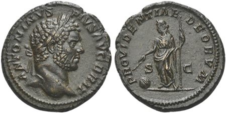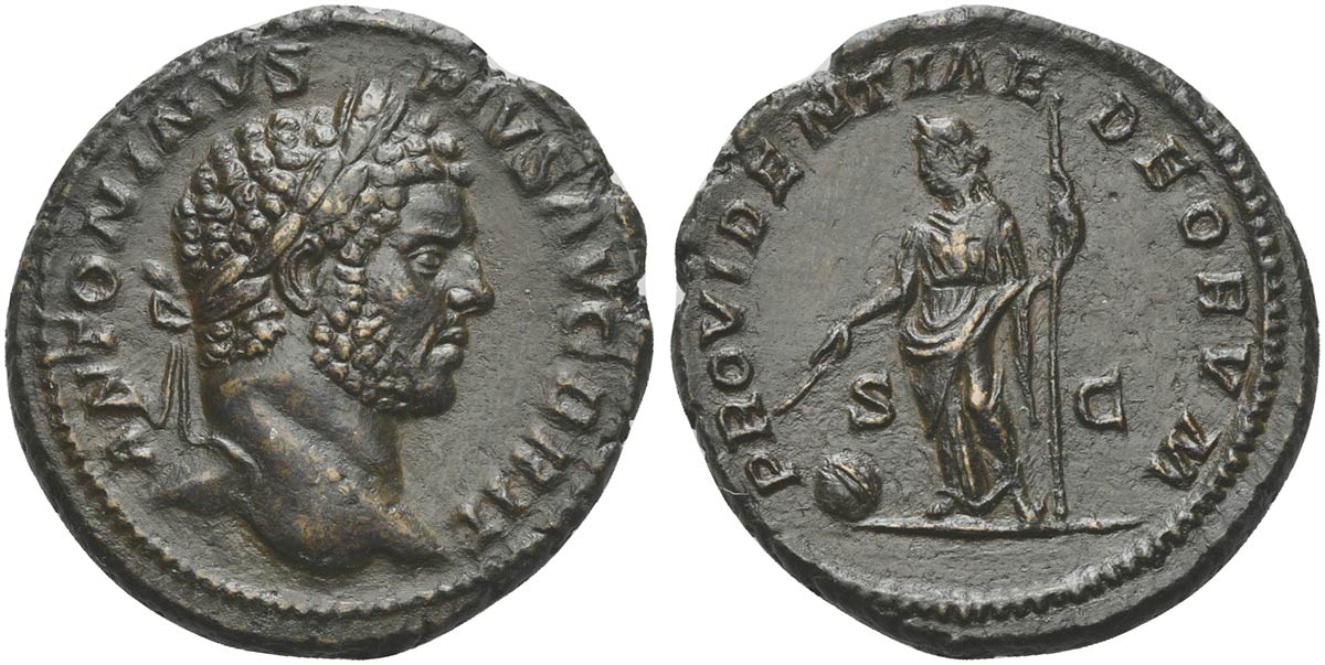 Caracalla (198-217), As, Rome, 210-3. AE (g 9,90; mm 26; h 12). ANTONINVS PIVS AVG BRIT, Laureate head r., Rv. PROVIDENTIAE DEORVM, Providentia standing l., holding sceptre and wand over globe at feet to l. RIC 519. Extremely fine