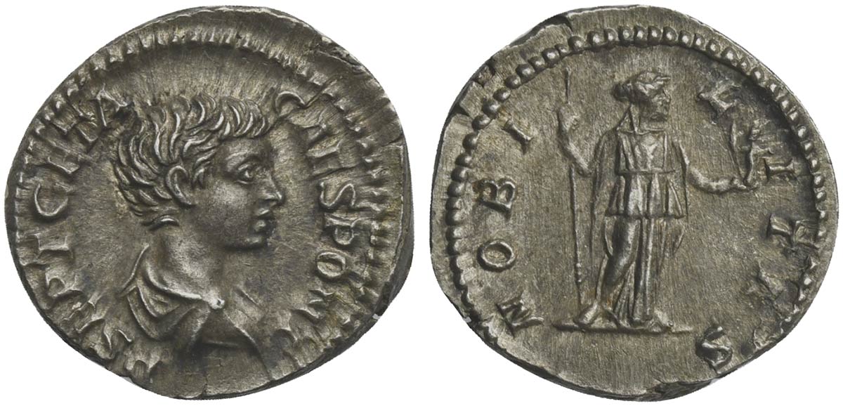 Geta (Caesar, 198-209), Denarius, Rome, ca. 200-5. AR (g 3,35; mm 19; h 12). P SEPT GETA CAES PONT, Bareheaded and draped bust r., Rv. NOBILITAS, Nobilitas standing facing, head r., holding sceptre and palladium. RIC 13a; RSC 90. Toned, extremely fine