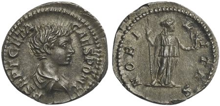 Geta (Caesar, 198-209), Denarius, Rome, ca. 200-5. AR (g 3,35; mm 19; h 12). P SEPT GETA CAES PONT, Bareheaded and draped bust r., Rv. NOBILITAS, Nobilitas standing facing, head r., holding sceptre and palladium. RIC 13a; RSC 90.