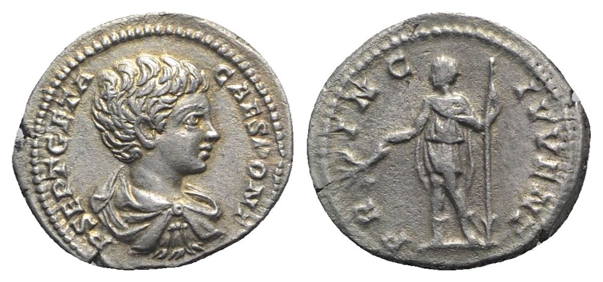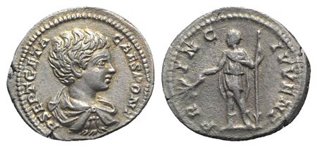 Geta (Caesar, 198-209), Denarius, Rome, c. 200-5. AR (g 3,18; mm 19; h 12). P SEPT GETA CAES PONT, Bare-headed, draped and cuirassed bust r.; Rv. PRINC IVVENT, Geta standing l., holding branch and spear. RIC 15b; RSC 159a. Toned, good very fine