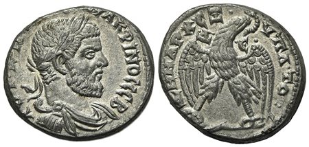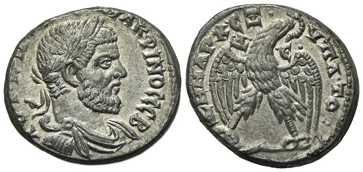 Macrinus (217-218). Seleucis and Pieria, Antioch, Tetradrachm. AR (g 14,60; mm 25,5; h 6). AVT K M OP CE MAKPINOC CEB, Laureate, draped and cuirassed bust r.; Rv. ΔΗΜΑΡΧ ΕΞ ΥΠΑ ΤΟ, Eagle standing facing on leg and thigh of sacrifi