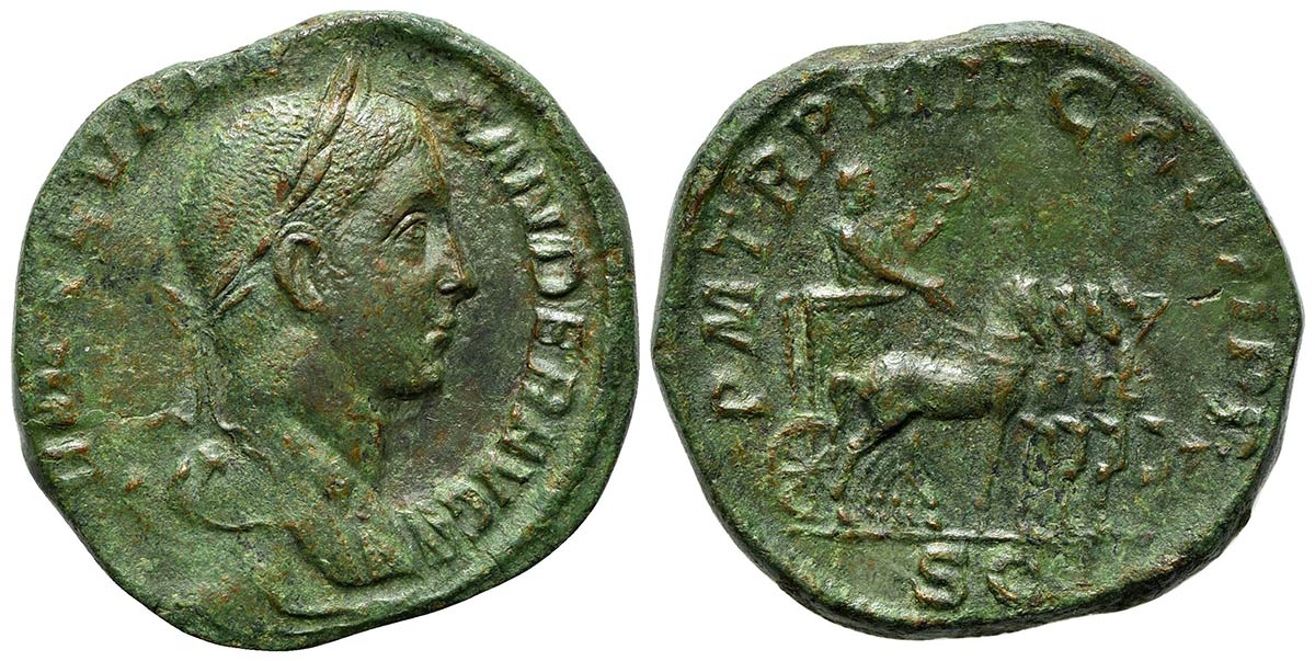 Severus Alexander (222-235), Sestertius, Rome, AD 229. AE (g 20,77; mm 30; h 1). IMP SEV ALEXANDER AVG, Laureate bust r., with slight drapery; Rv. P M TR P VIII COS III P P, Emperor driving triumphal quadriga r., holding eagle-tipped sceptre and reins. RIC 495. Rare. Green patina, very fine - good very fine