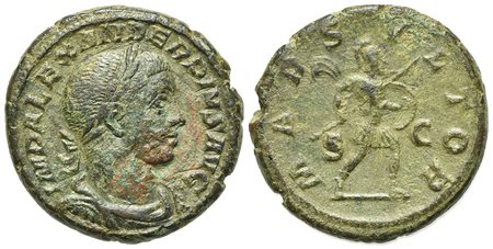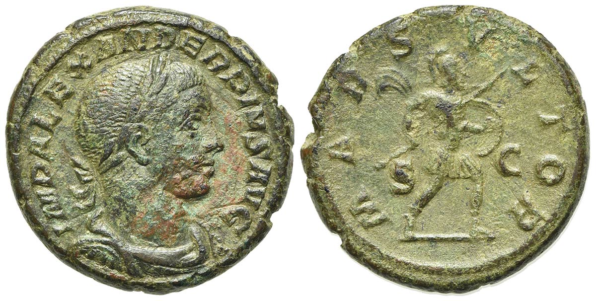 Severus Alexander (222-235), As, Rome, 231-5. AE (g 12,24; mm 25; h 12). IMP ALEXANDER PIVS AVG, Laureate, draped and cuirassed bust r.; Rv. MARS VLTOR, Mars advancing r., holding spear and shield, S - C. RIC 637. Green patina, very fine