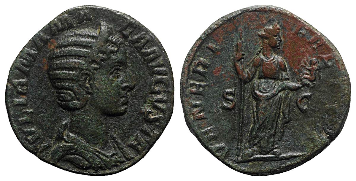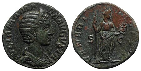 Julia Mamaea (Augusta, 222-235), Sestertius, Rome, AD 224. AE (g 14,87; mm 29; h 12). IVLIA MAMAEA AVGVSTA, Draped bust r., wearing stephane; Rv. VENERI FELICI, Venus standing r., holding sceptre and Cupid, S - C. RIC 694 (Alexander). Green patina, very fine
