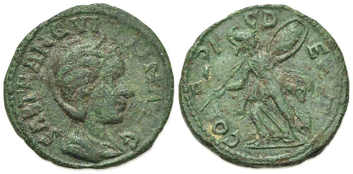 Tranquillina (Augusta, 241-244), Thrace, Deultum. AE (g 8,42; mm 23; h 6). SAB TRANQVILLINA AVG, Diademed and draped bust r.; Rv. COL - FL PA-C D-EULT, Athena advancing l., head r., brandishing spear and shield. Jurukova 394. Green patina, near very fine