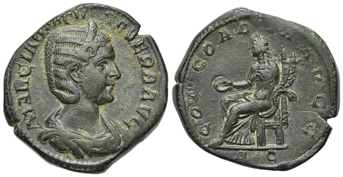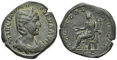 Otacilia Severa (Augusta, 244-249), Sestertius, Rome, AD 246. AE (g 20.59; mm 30; h 7). MARCIA OTACILIA SEVERA AVG, Draped bust r., wearing stephane; Rv. CONCORDIA AVGG, Concordia seated l., holding patera and double cornucopia. R