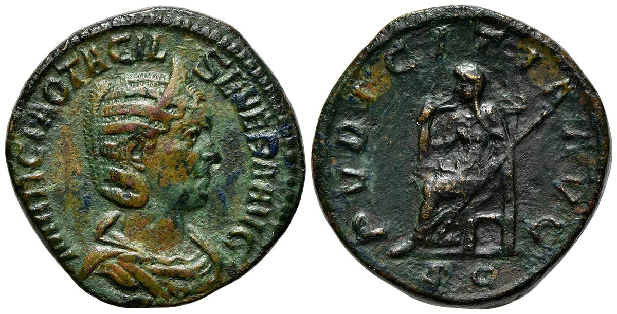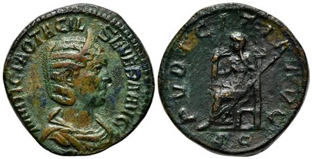 Otacilia Severa (Augusta, 244-249), Sestertius, Rome. AE (g 20,60; mm 30; h 12). MARCIA OTACIL SEVERA AVG, Diademed and draped bust r.; Rv. PVDICITIA AVG, Pudicitia seated l., drawing veil from her face and holding a sceptre, SC.