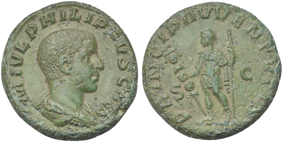 Philip II (Caesar, 244-247), As, Rome, AD 244. AE (g 9,76; mm 25; h 5). M IVL PHILIPPVS CAES, Bareheaded and draped bust r., Rv. PRINCIPI IVVENTVTIS, Philip II standing l., holding signum and spear. RIC 258b. Green patina, some roughness, good very fine