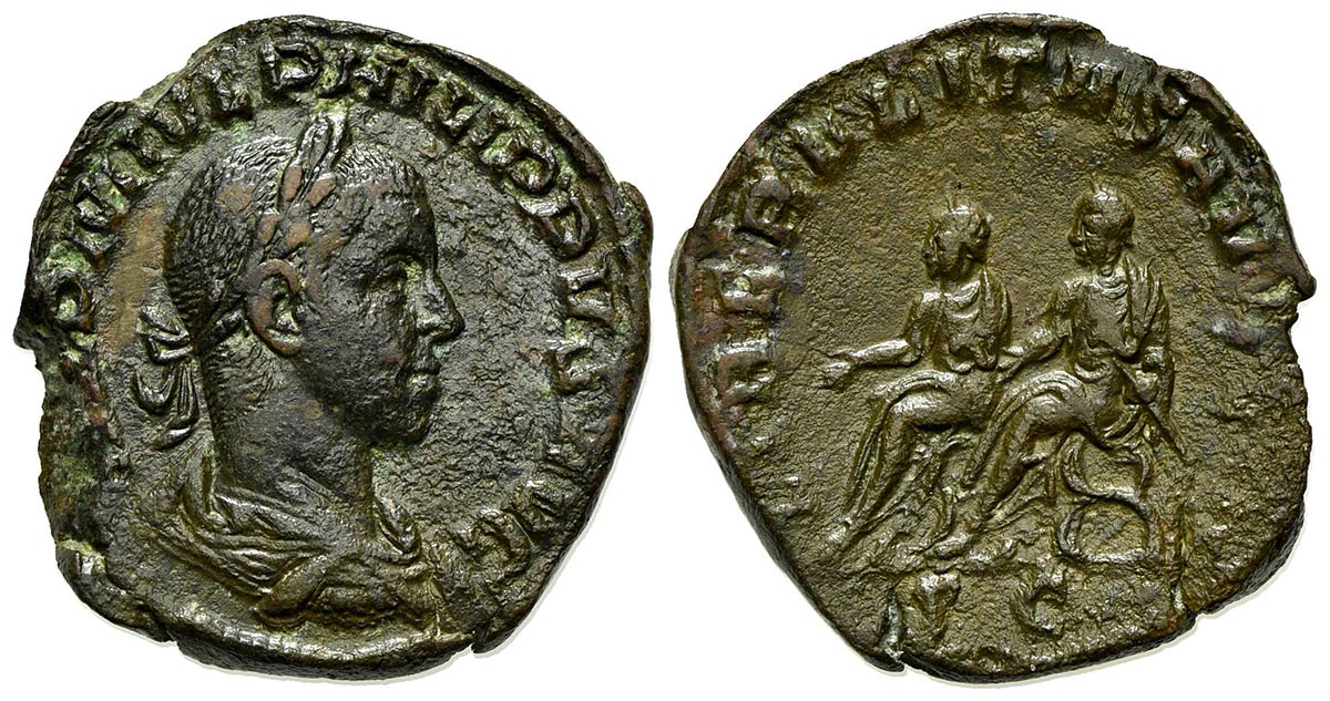 Philip II (Caesar, 244-247), Sestertius, Rome, 247-9. AE (g 17,69; mm 28; h 12). IMP M IVL PHILIPPVS AVG, Laureate, draped and cuirassed bust r.; Rv. LIBERALITAS AV[GG III], Philip I and Philip II, both togate and laureate, seated l. on curules chairs, their r. hands outstretched. RIC 267a. Very fine