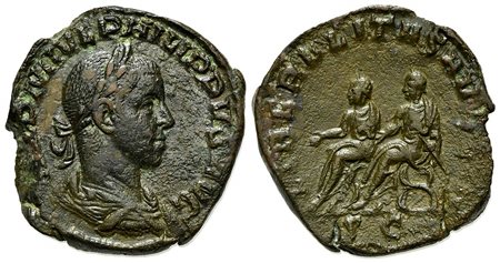 Philip II (Caesar, 244-247), Sestertius, Rome, 247-9. AE (g 17,69; mm 28; h 12). IMP M IVL PHILIPPVS AVG, Laureate, draped and cuirassed bust r.; Rv. LIBERALITAS AV[GG III], Philip I and Philip II, both togate and laureate, seated