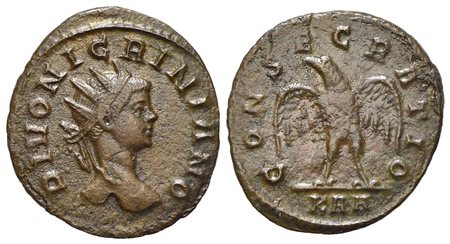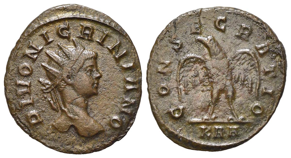 Divus Nigrinian (died c. AD 284). Antoninianus (g 2.82, mm 19, h 4). Rome, struck under of Carinus, November AD 284. DIVO NIGRINIANO, Radiate head r., Rv. CONSECRATIO, Eagle standing facing, head l., with wings spread; KAA. RIC 47