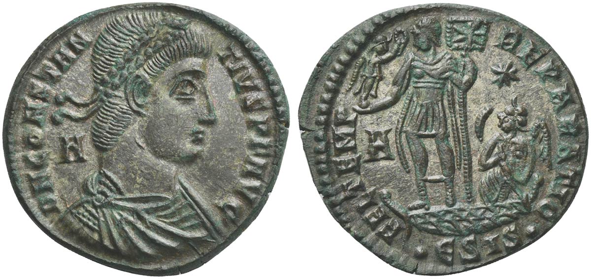 Constantius II (337-361), Centenionalis, Siscia, 348-350. AE (g 6,33; mm 25; h 12). D N CONSTANTIVS P F AVG, Pearl-diademed, draped and cuirassed bust r.; A behind, Rv. FEL TEMP REPARATIO, Emperor standing facing, head l., on galley sailing l., holding Victory on globe and labarum; behind, Victory seated l., steering galley; A-star//•ESIS•. RIC 255. Silvered, extremely fine