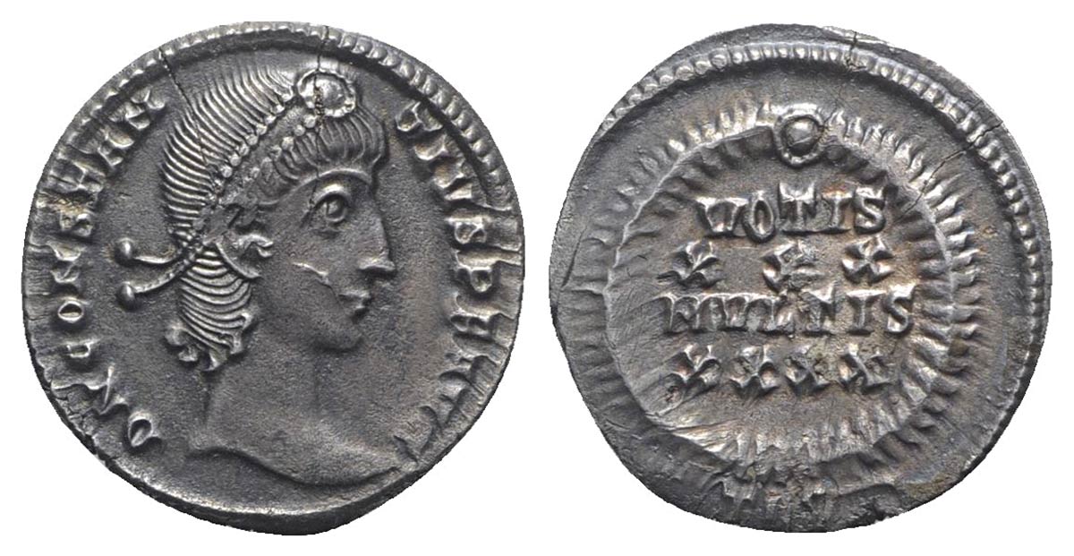 Constantius II (337-361), Siliqua, Thessalonica. AR (g 3,13; mm 20; h 11). D N CONSTAN-TIVS P F AVG, Diademed head r.; Rv. VOTIS / XXX / MVLTIS / XXXX in four lines; TES. RIC 163; RSC 341c. Toned, flan-cracks, otherwise good very fine