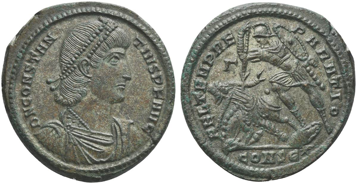 Constantius II (337-361), Bronze, Constantinople, 348-351. AE (g 7,70; mm 25; h 12). D N CONSTANTIVS P F AVG, Pearl-diademed, draped and cuirassed bust r., Rv. FEL TEMP REPARATIO, Soldier standing l., holding round shield and spearing fallen horseman to lower r.; Γ//CONSE-star. RIC 81. Extremely fine