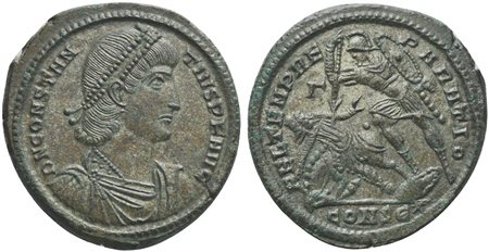 Constantius II (337-361), Bronze, Constantinople, 348-351. AE (g 7,70; mm 25; h 12). D N CONSTANTIVS P F AVG, Pearl-diademed, draped and cuirassed bust r., Rv. FEL TEMP REPARATIO, Soldier standing l., holding round shield and spea
