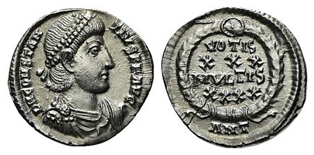 Constantius II (337-361), Siliqua, Antioch, 347-355. AR (g 2,03; mm 18; h 12). D N CONSTANTIVS P F AVG, Pearl-diademed, draped and cuirassed bust r.; Rv. VOTIS/XXX/MVLTIS/XXXX in four lines within wreath; ANT. RIC 108; RSC 342-3p.