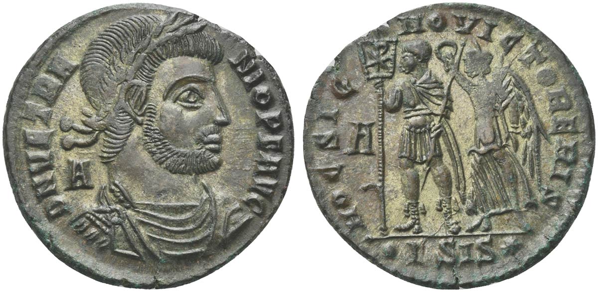 Vetranio (AD 350), AE, Siscia. AE (g 4,80; mm 24; h 12). D N VETRANIO P F AVG, Diademed, draped and cuirassed bust r.; A behind, Rv. HOC SIGNO VICTOR ERGIS, Vetranio standing l., holding standard with chi-rho on banner and spear,