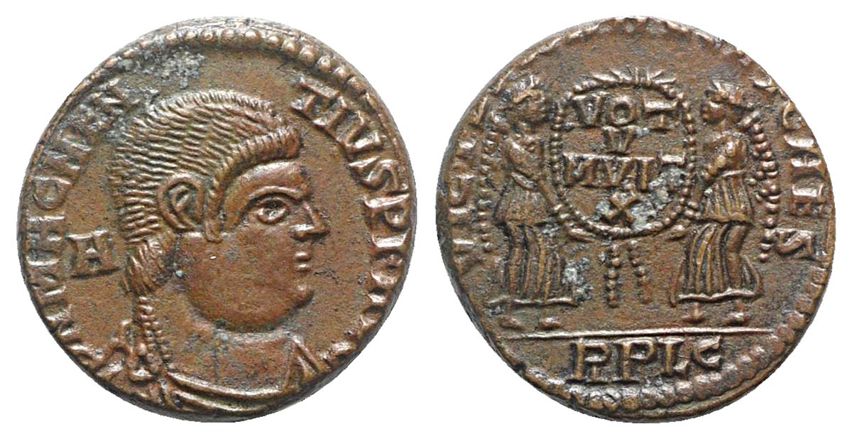 Magnentius (350-353), Centenionalis, Lugdunum, 351-3. AE (g 6,00; mm 19; h 6). D N MAGNEN TIVS P F AVG, Bare-headed, draped and cuirassed bust r.; Rv. VICT DD NN AVG ET CAES, Two Victories supporting shield inscribed VOT/ V/ MVLT/