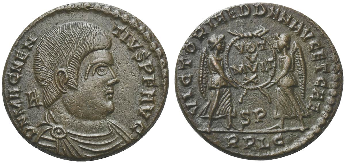 Magnentius (350-353), Centenionalis, Lugdunum, 351-2. AE (g 5,07; mm 21; h 6). D N MAGNEN-TIVS P F AVG, Bareheaded, draped and cuirassed bust r., Rv. VICTORIAE D D N N AVG ET CAE, Two Victories standing facing each other, holding