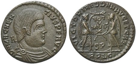 Magnentius (350-353), Centenionalis, Lugdunum, 351-2. AE (g 5,07; mm 21; h 6). D N MAGNEN-TIVS P F AVG, Bareheaded, draped and cuirassed bust r., Rv. VICTORIAE D D N N AVG ET CAE, Two Victories standing facing each other, holding between them shield inscribed VOT/V/MVLT/X in four lines; SP//RPLG. RIC 136. Extremely fine
