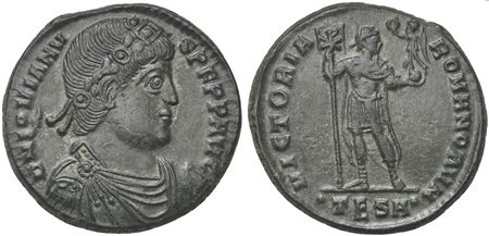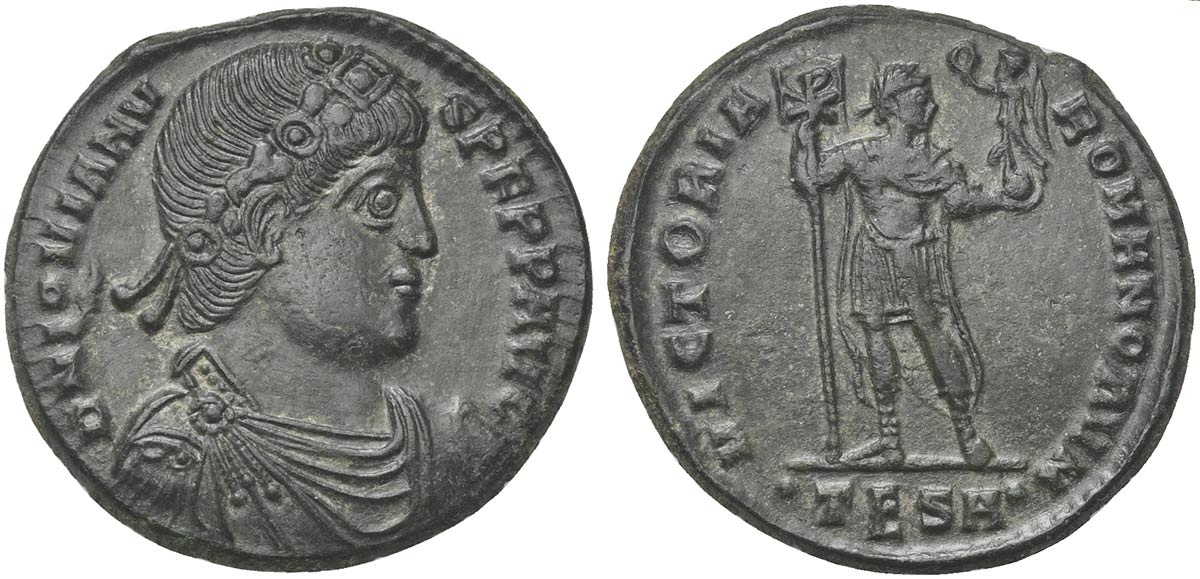 Jovian (363-364), Nummus, Thessalonica, AD 363-364. AE (g 8,55; mm 27; h 12). D N IOVIANV – S PERP AVG, diademed, draped and cuirassed bust r., Rv. VICTORIA – ROMANORVM, Emperor standing facing, head r., holding labarum ornamented