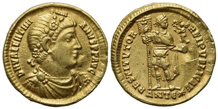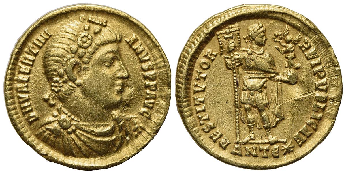 Valentinian I (364-375), Solidus, Antioch, AD 365. AV (g 4,42; mm 21; h 6). D N VALENTINI ANVS P F AVG, Pearl and rosette diademed, draped and cuirassed bust r.; Rv. RESTITVTOR REI PVBLICAE, Valentinian standing facing, head r., h