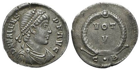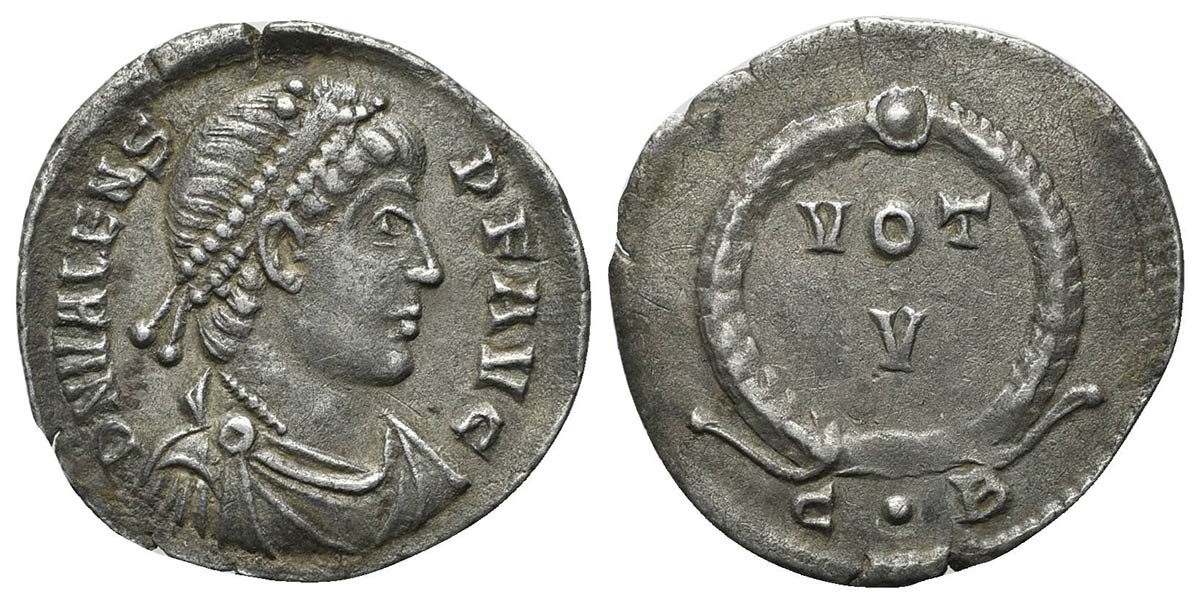 Valens (364-378), Siliqua, Constantinople, 364-7. AR (g 1,80; mm 18; h 6). D N VALENS P F AVG, Pearl-diademed, draped and cuirassed bust r.; Rv. VOT/V in two lines within laurel wreath; C•B. RIC 13d.8; RSC 88†b. Toned, good very fine
