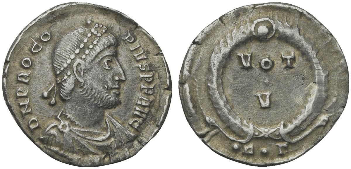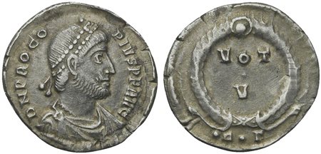 Procopius (Usurper, 365-366), Siliqua, Constantinople. AR (g 1,99; mm 19; h 12). D N PROCO-PIVS P F AVG, Pearl-diademed, draped and cuirassed bust r., Rv. VOT/V in two lines; all within wreath • C • Γ. RIC 13e.1; RSC 14†d. . Good very fine