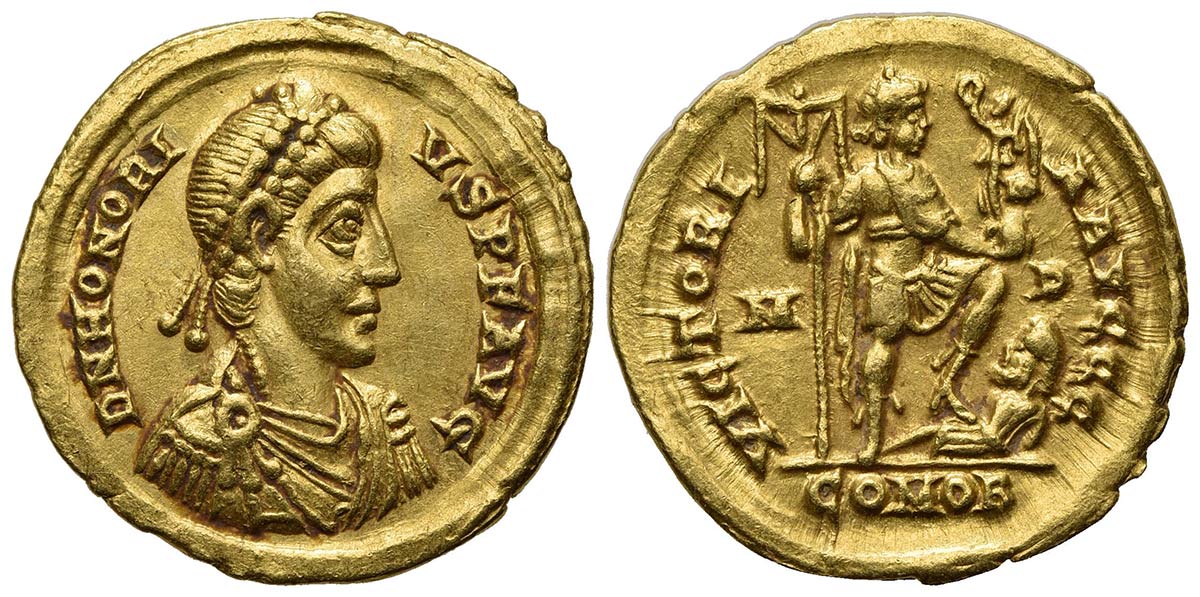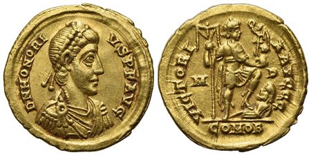 Honorius (393-423), Solidus, Mediolanum, 395-423. AV (g 4,47, mm 21,5, h 6). D N HONORIVS P F AVG, Pearl-diademed, draped and cuirassed bust r.; Rv. VICTORIA AVGGG, Honorius standing r., holding vexillum and Victory on globe, and