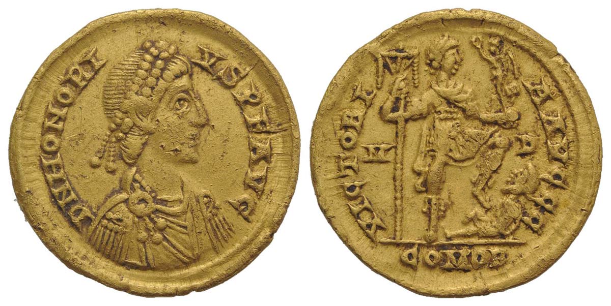 Honorius (393-423), Solidus, Mediolanum, 395-423. AV (g 4,49, mm 21, h 6). D N HONORIVS P F AVG, Pearl-diademed, draped and cuirassed bust r.; Rv. VICTORIA AVGGG, Honorius standing r., holding vexillum and Victory on globe, and wi