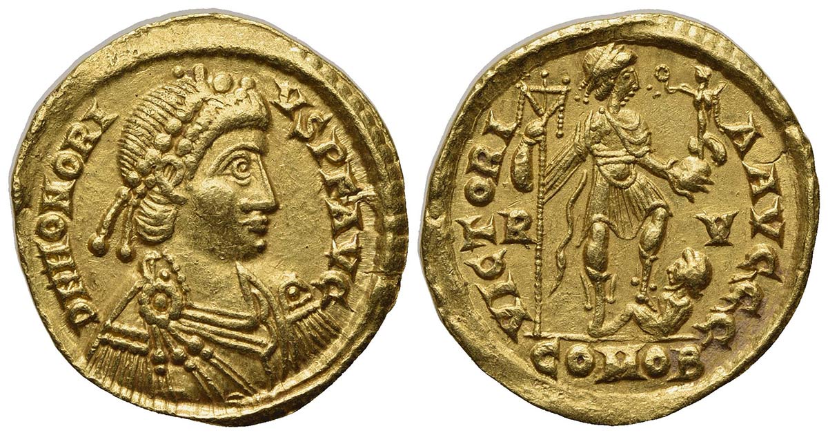 Honorius (393-423), Solidus, Ravenna, 402-6. AV (g 4,46, mm 20, h 6). D N HONORIVS P F AVG, Pearl-diademed, draped and cuirassed bust r.; Rv. VICTORIA AVGGG, Honorius standing r., spurning captive, holding labarum and Victory on globe; R-V//COMOB. RIC 1287d; Ranieri 12; Depeyrot 7/1. Extremely fine