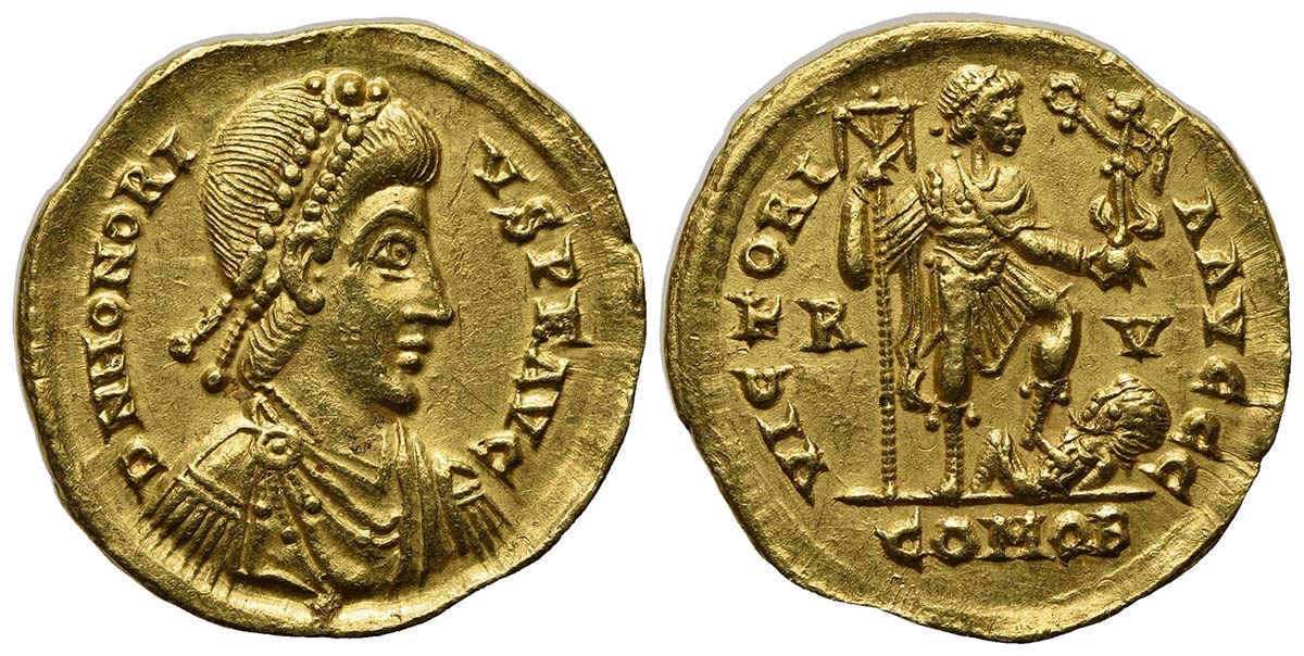 Honorius (393-423), Solidus, Ravenna, 402-6. AV (g 4,47, mm 21, h 6). D N HONORIVS P F AVG, Pearl-diademed, draped and cuirassed bust r.; Rv. VICTORIA AVGGG, Honorius standing r., spurning captive, holding labarum and Victory on g
