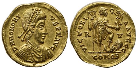 Honorius (393-423), Solidus, Ravenna, 402-6. AV (g 4,47, mm 21, h 6). D N HONORIVS P F AVG, Pearl-diademed, draped and cuirassed bust r.; Rv. VICTORIA AVGGG, Honorius standing r., spurning captive, holding labarum and Victory on globe; R-V//COMOB. RIC 1287d; Ranieri 12; Depeyrot 7/1. Extremely fine