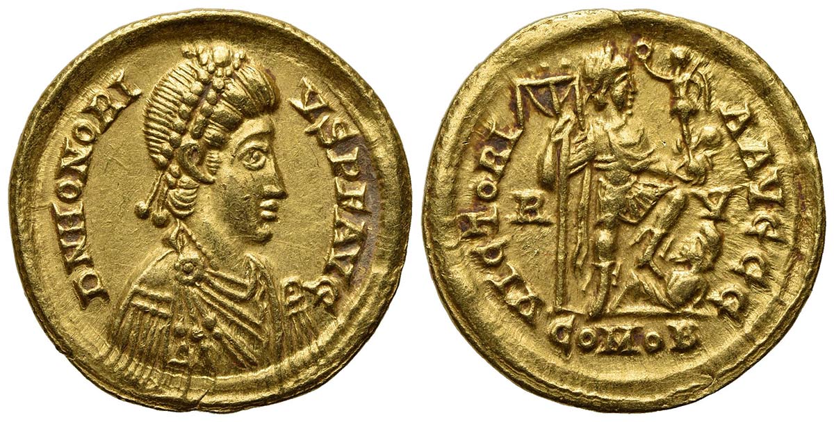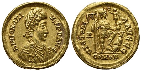 Honorius (393-423), Solidus, Ravenna, 402-6. AV (g 4,45, mm 21, h 6). D N HONORIVS P F AVG, Pearl-diademed, draped and cuirassed bust r.; Rv. VICTORIA AVGGG, Honorius standing r., spurning captive, holding labarum and Victory on g