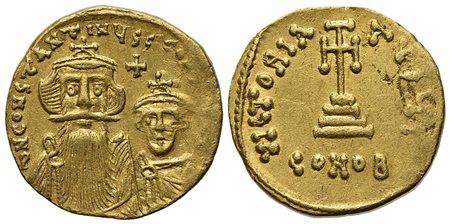 Constans II (641-668); AV Solidus (g 4,32; mm 20; h 6); Constantinople, 654-659. Crowned busts of Constans and Constantine facing, both wearing chlamys; cross above; Rv. Cross potent set on three steps; I//CONOB. MIB 26; DOC 25j; Sear 959. Good very fine - near extremely fine
