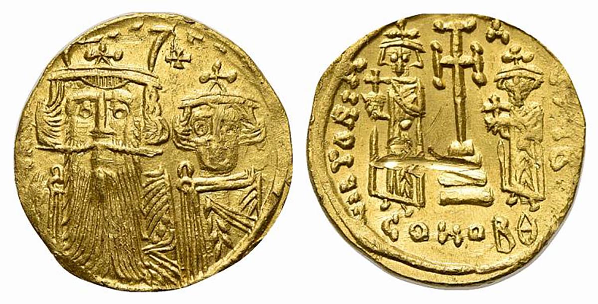 Constans II and Constantine IV (641-668); AV Solidus (g 4,49; mm 19; h 6); Constantinople, 654-659. Crowned and draped facing busts of Constans and Constantine; cross above; Rv. Cross potent set upon three steps; B//CONOBΘ. MIB 34; DOC -; Sear 969. Scratch on rev., otherwise good very fine