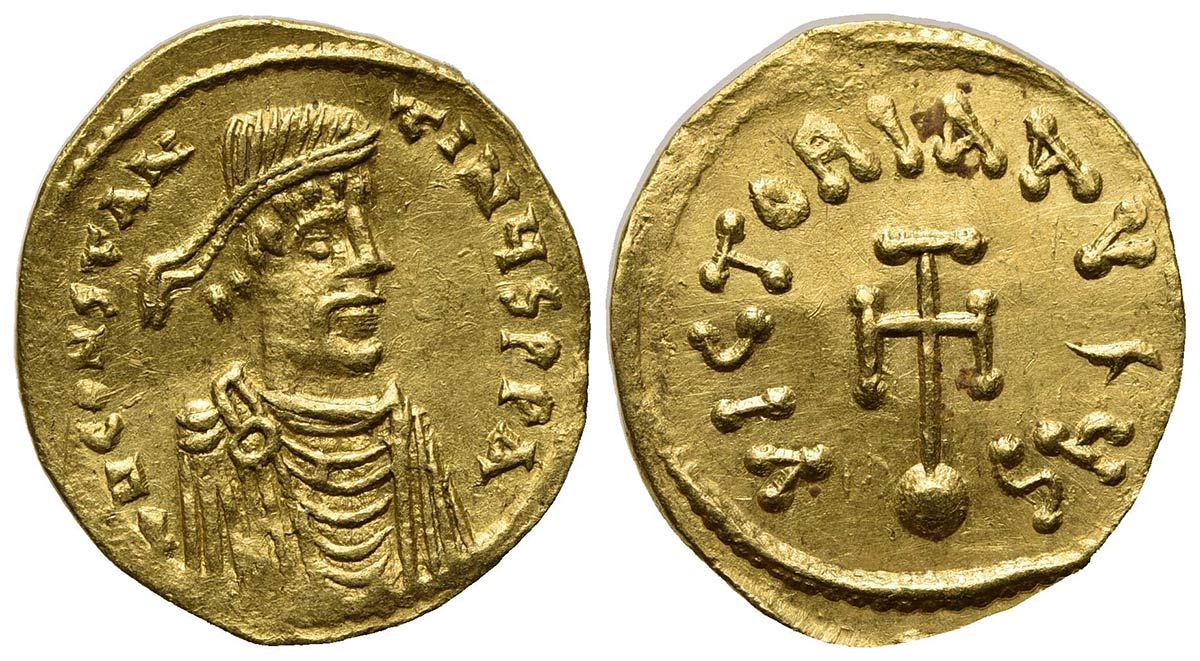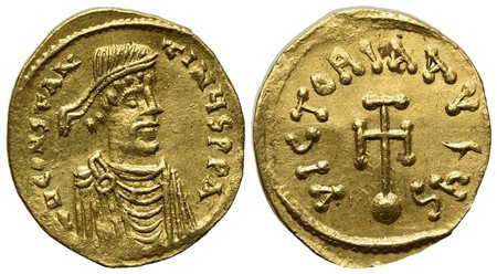 Constans II (641-668); AV Semissis (g 2,21; mm 17; h 6); Constantinople. Diademed, draped and cuirassed bust r.; Rv. Cross potent set on globe. MIB 50; DOC 44; Sear 983. Good very fine