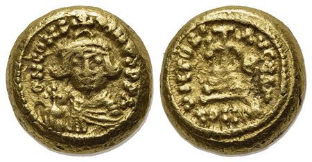 Constans II (641-668); AV Solidus (g 4,59; mm 11; h 6). Carthage, year 6 (647/8). Crowned and draped bust facing, holding globus cruciger; Rv. Cross potent set upon three steps; Θ to r.; ς//CONOB. MIB 59; DOC 111; Sear 1033. Near very fine