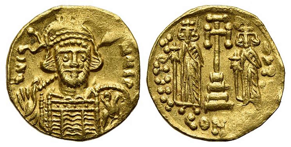 Constantine IV (668-685); AV Solidus (g 4,37; mm 18,5; h 6); Constantinople, 674-681. Helmeted and cuirassed bust facing slightly r., holding spear and shield; Rv. Cross potent set on three steps; at sides, Heraclius and Tiberius standing facing, each holding globus cruciger; [...]//CONOB. MIB 7; DOC 10; Sear 1156. Area of flatness, very fine