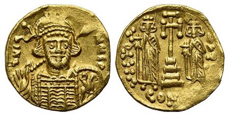 Constantine IV (668-685); AV Solidus (g 4,37; mm 18,5; h 6); Constantinople, 674-681. Helmeted and cuirassed bust facing slightly r., holding spear and shield; Rv. Cross potent set on three steps; at sides, Heraclius and Tiberius
